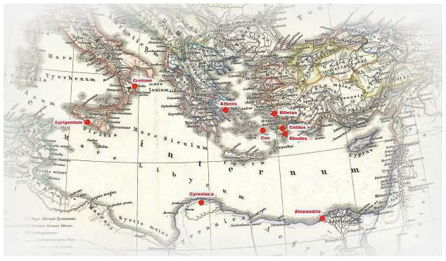 Эта теория нашла свое развитие в трудах старейших медицинских школ античной Греции (школы островов Книдос, Кос, Родоса, Милета, Александрии и др., рис. 1.01), Гиппократа (греч. Ἱπποκράτης,